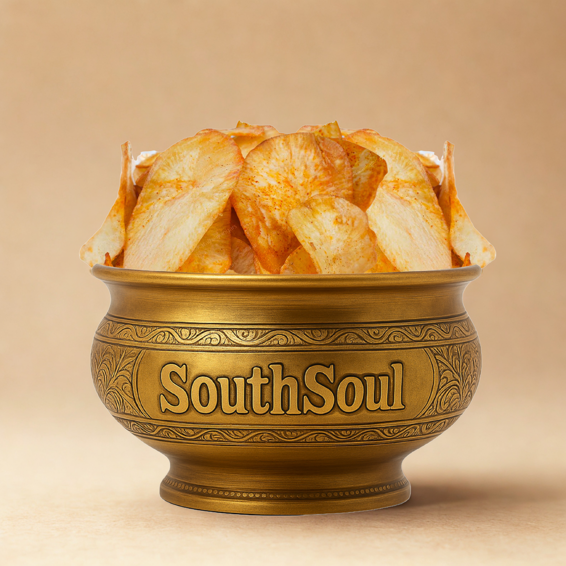 At SouthSoul, we slice fresh, locally sourced tapioca and fry it in pure palm oil using traditional methods. Lightly salted or spiced with chili and pepper, these chips are a wholesome, satisfying snack that pairs perfectly with tea or a South Indian meal.